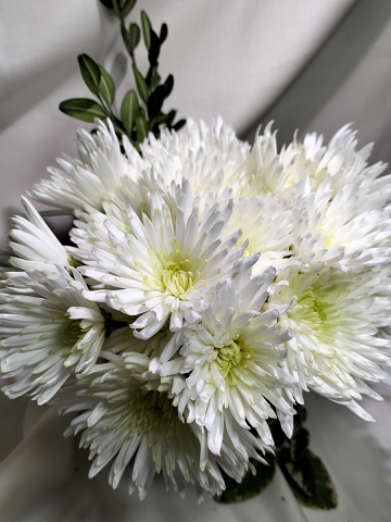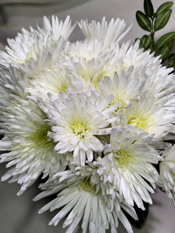 Букетная хризантема, кустовая. Игольчатая хризантема, белая с желто зелёной сердцевиной.